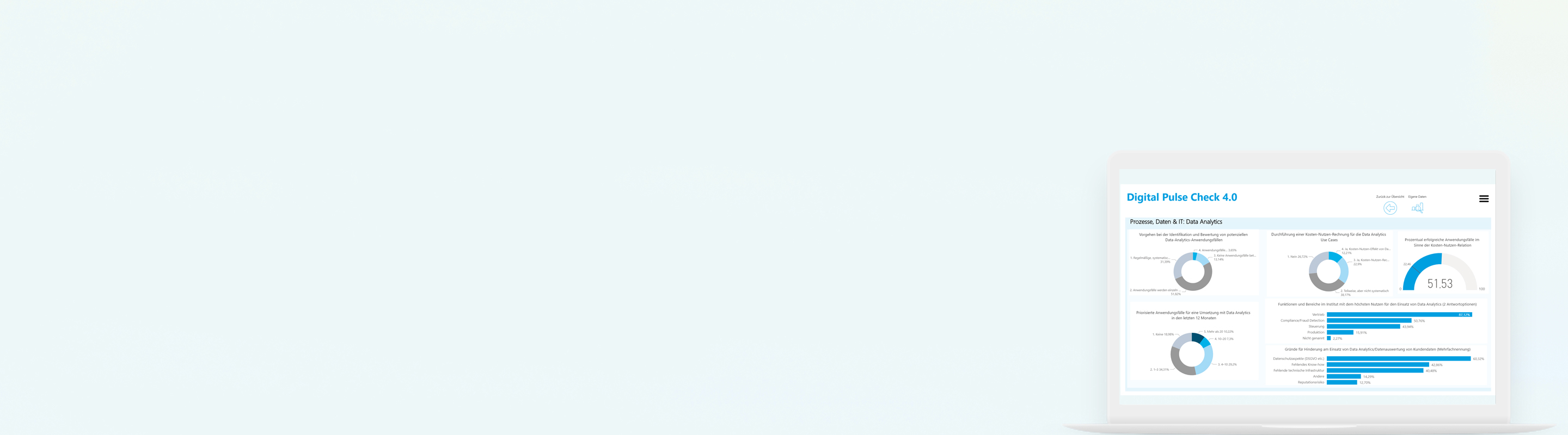 Werfen Sie einen Blick auf unsere spannenden Ergebnisse - von der Digitalisierungsstrategie und den Geschäftsmodellen bis hin zu digitalen Prozessen, Daten, IT sowie Management & Organisation.