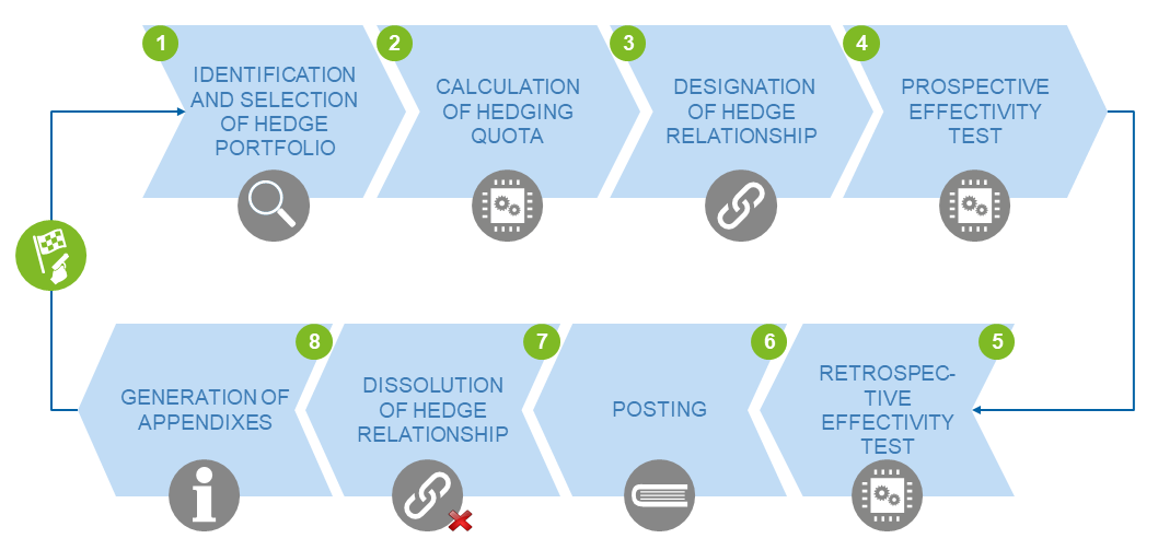 - Full support of controlling and treasury management processes, from creating the hedge relationship, through to executing effectiveness tests, determining posting effects and subsequent plausibility checks